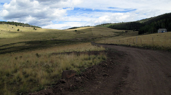 You will drop down crossing a low area where you will pass intersections with FR425, a short spur road, Horse Ranch, FR428, another shorter spur road, and Bear Creek, FR419, a spur road a little over a mile long. The road will head down out of the trees into a large wide meadown. There are private homes to the east of this meadow and cattle are grazed in the area.