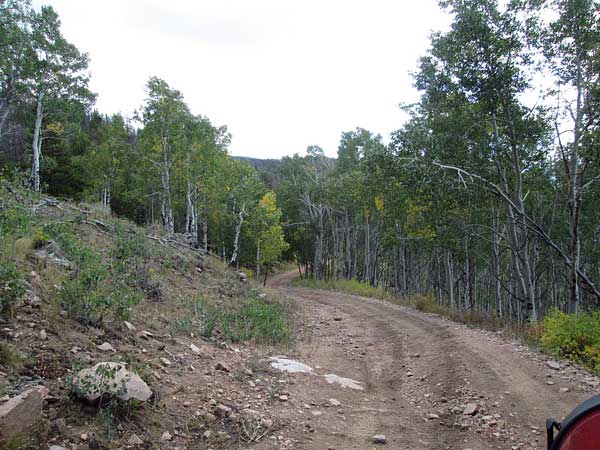 The pine forest will give way to the aspen groves on the lower hill sides. The road will continue to wind down through broad switchbacks working its way along shallow gullies.