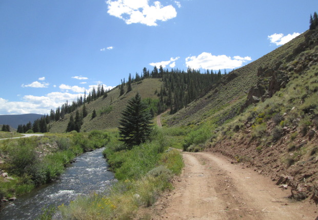 The Mercury Mine road leaves Hwy 114 after you enter the southern end of Cochetopa Canyon. Just past a bridge there will be a gravel road that drops down and follows along Cochetopa Creek, between it and a high ridge.