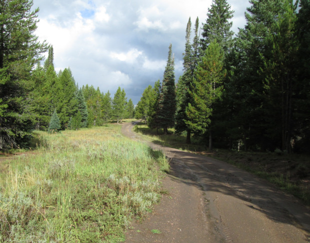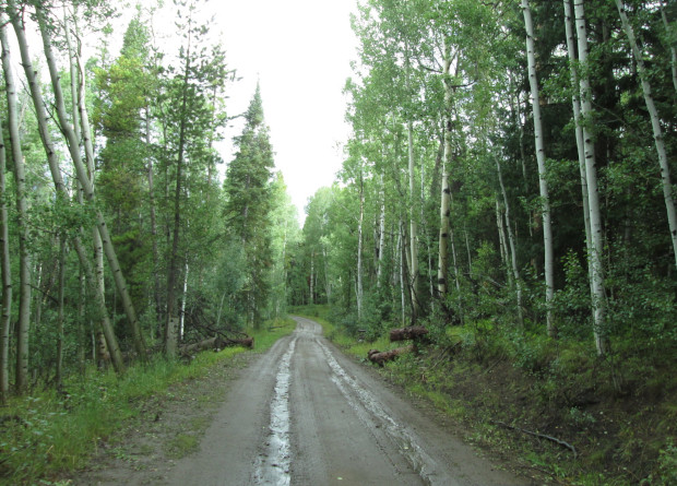 After a short distance you will pass a dispersed campsite on the left and then another on the right. Continuing you will head through the forest, a mix of aspen and pine, before dropping down a small hill into an open area.