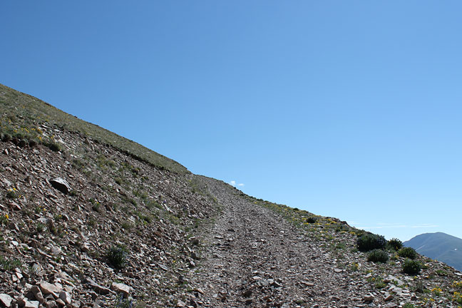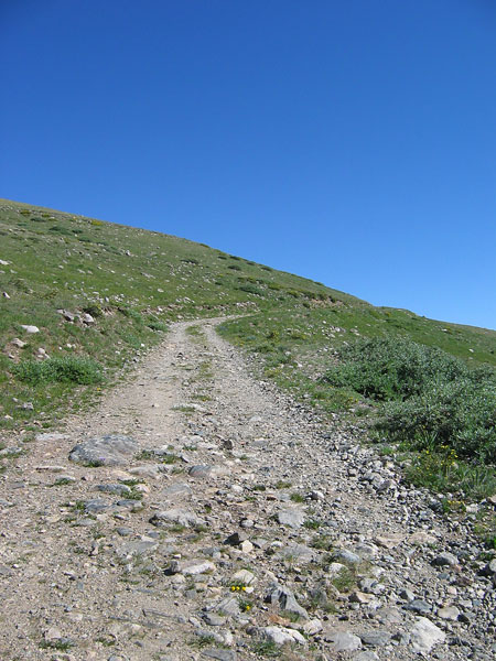 Beyond the gate, the old road climbed around to the north, then northwest, to climb the southeast ridge of Mount Lincoln. At one time this old wagon road went all the way to the Present Help mine at the summit of Mount Lincoln.  |