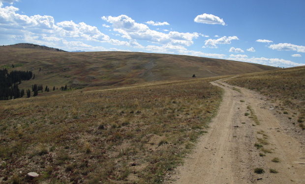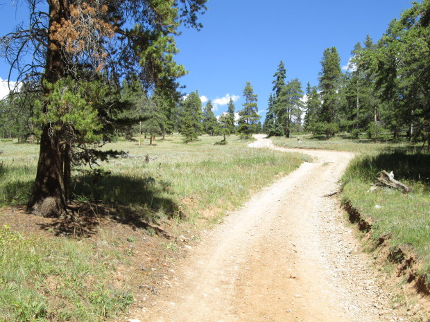 The road will head back into more trees as it continues its climb. The next intersection is with No Name, FR189, road on the left. Stay to the right and continue climbing. The road will continue through the trees and then come out into another larger meadow. At the top of the meadow will be a bare ridge. To reach the top of the ridge the road will climb a last very steep section, that is the only real challenge, make a left turn and come to an T intersection.