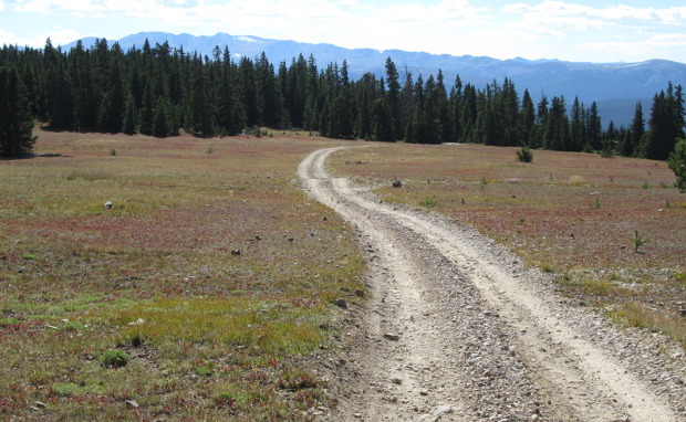 Mt Zion starts out right off of Hwy 24. At the turn off is a small parking area followed by a larger parking area. Just past the larger parking area is a road to the right, Trail Road, that goes a short distance to the east and ends. The second right is another very short spur that ties into Trail Road. The next two right turns are part of a loop that goes into the trees to some dispersed campsites. After you go into the trees a short disance from the camping loop you will come to another right turn that also dead ends. Staying to the left through this section will keep you on the Mt Zion road. After the last intersection the road will climb a hill and begin its climb into the forest. The road will be a two track through the trees. After three quarters of a mile from the last intersection you will come out into some small meadows in the forest.