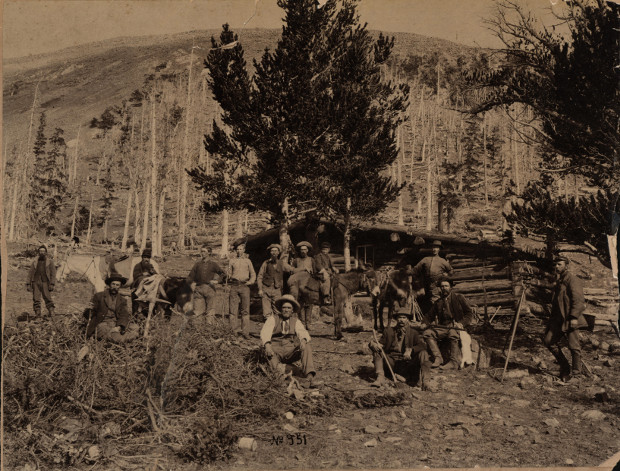 | A group of miners at the townsite of Shavano, approximately 1882. Image from Dr. Howard Smith, son of Mr. and Mrs. George Smith. The teenager at left of cabin is George Smith. This image is part of the Donna Nevens Collection. |