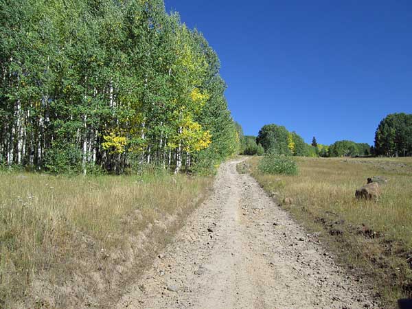 Past the large intersection the road will curve to the left with a spur loop off to the right going to some campsites. The main road will pass a marshy are and then come to the intersection with Martin Ridge, FR253, on your left. Continuing on the main road it will head through heavier forests with no real opening or views. After about a mile and a half from the last intersection will be Latern Ridge, FR254, to your left. FR250 will continue southeast and enter into more aspen forest areas with some openings and small meadows along the road. At a swooping S curve in the road where it runs along the edge of an open meadow will be an intersection with Elbow Park, FR258, on the right. Past this intersection the road heads into the aspen forest heading northeast before it come out into open meadows again.