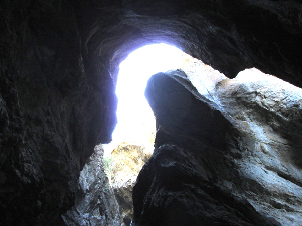 After leaving Hwy 150 you will pass a wide area with a loop road around a kiosk. The road is two lanes wide, but becomes very rough. It will climb into the sage brush through a series of switchbacks. As you continue to gain altitude you will do two very long swtichbacks before coming to the main Zapata Falls parking area and trail head. There is a side road to the campground and a loop road with two parking areas at the trail head. Some picnic tables are in the trees around this loop. At the trail head there is a restroom.